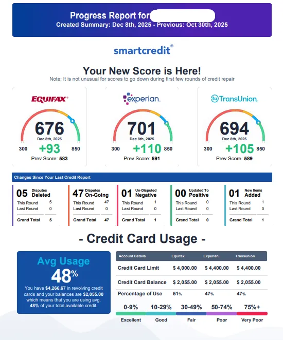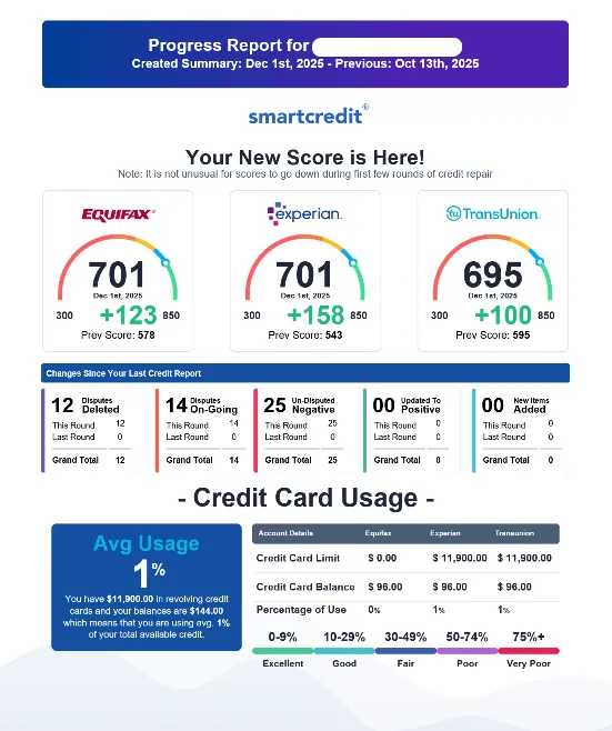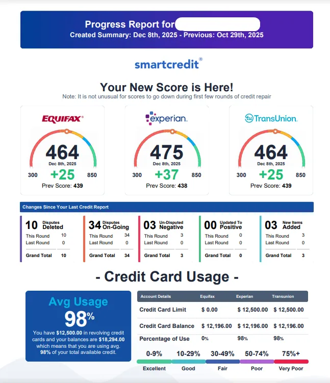 (Clients should receive updated credit reports every 45 days. It is the client's responsibility to make us aware if